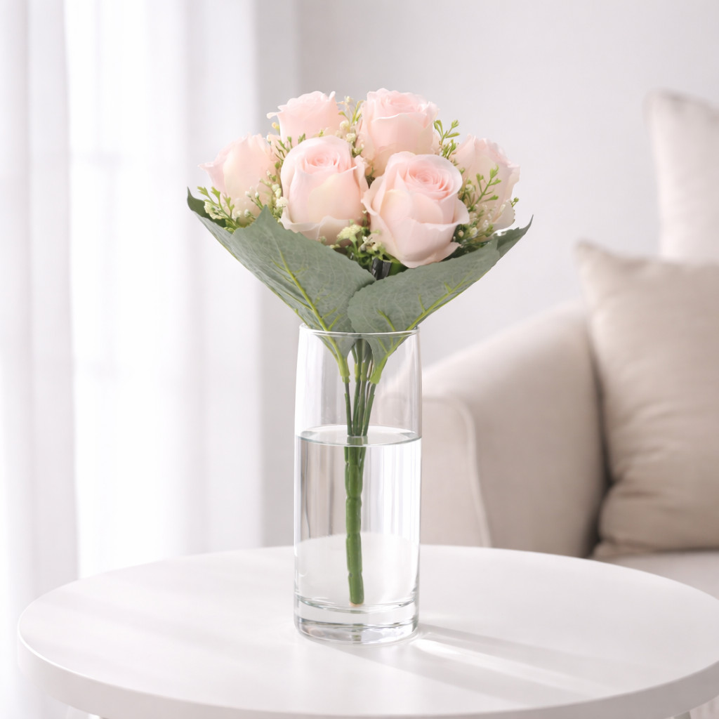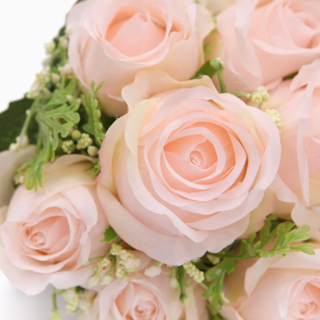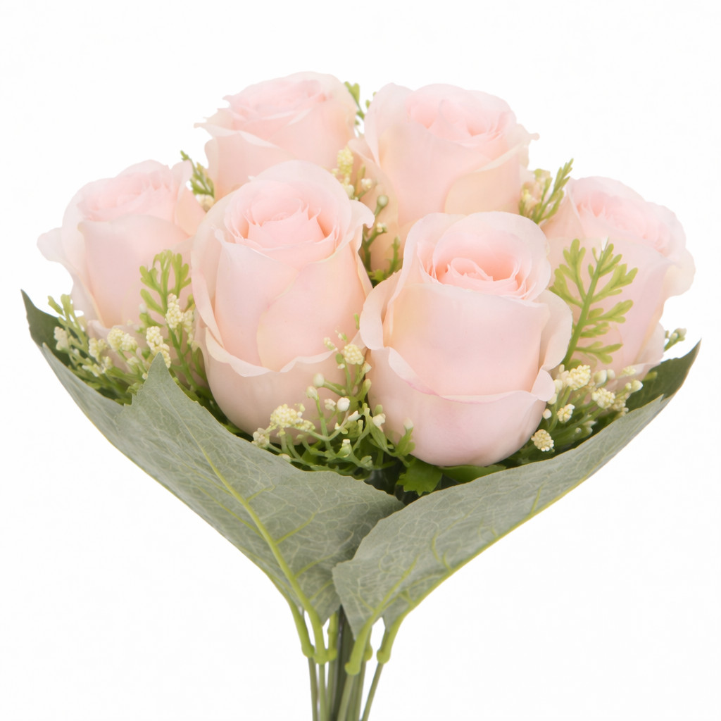 A 40 cm-es 9 fejes halvány rózsaszín selyem rózsacsokor elegáns és természetes hatású művirág dekoráció, amely bármely térben romantikus, lágy hangulatot teremt. A részletgazdag selyem szirmok és a gondosan kidolgozott levelek valósághű megjelenést biztosítanak, miközben hosszú távon megőrzik szépségüket.