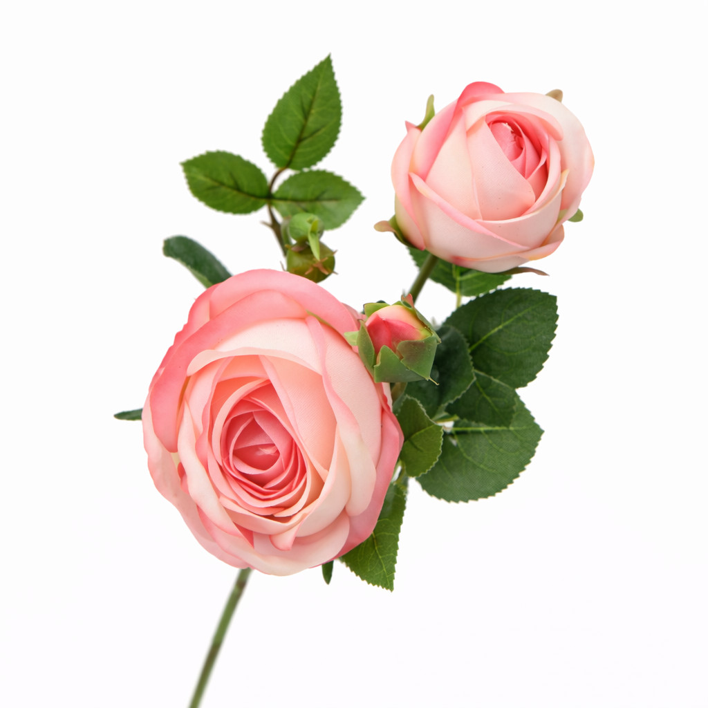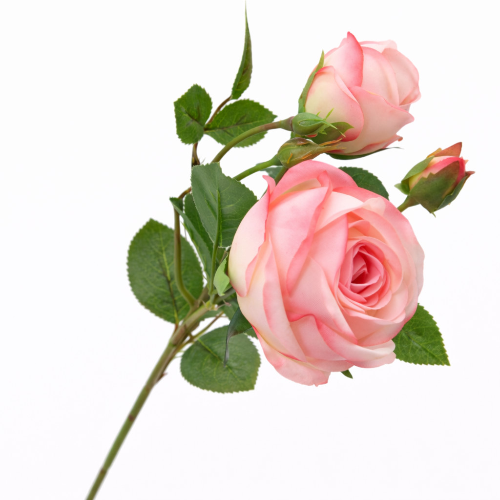 A 46 cm-es 3 fejes pasztell rózsaszín selyem rózsa stílusos és időtálló dekorációs elem. A két nyíló virág és az egy bimbó természetes hatást biztosít, így önálló díszként vagy csokor részeként is elegáns megoldás.