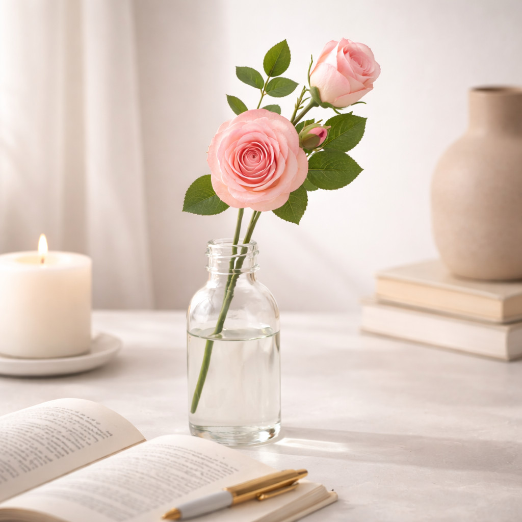 • 3 fejes, természetes kompozíció: Két nyíló rózsa és egy bimbó harmonikus elrendezésben.