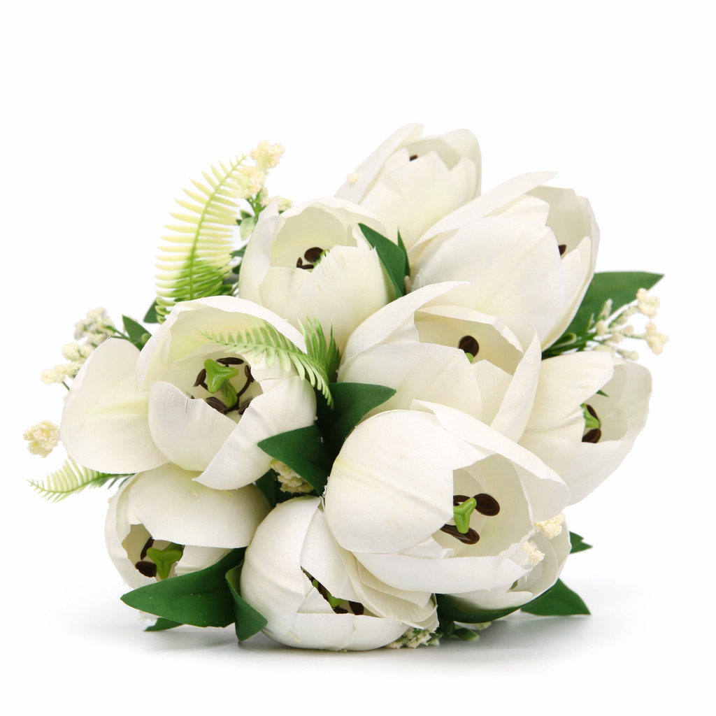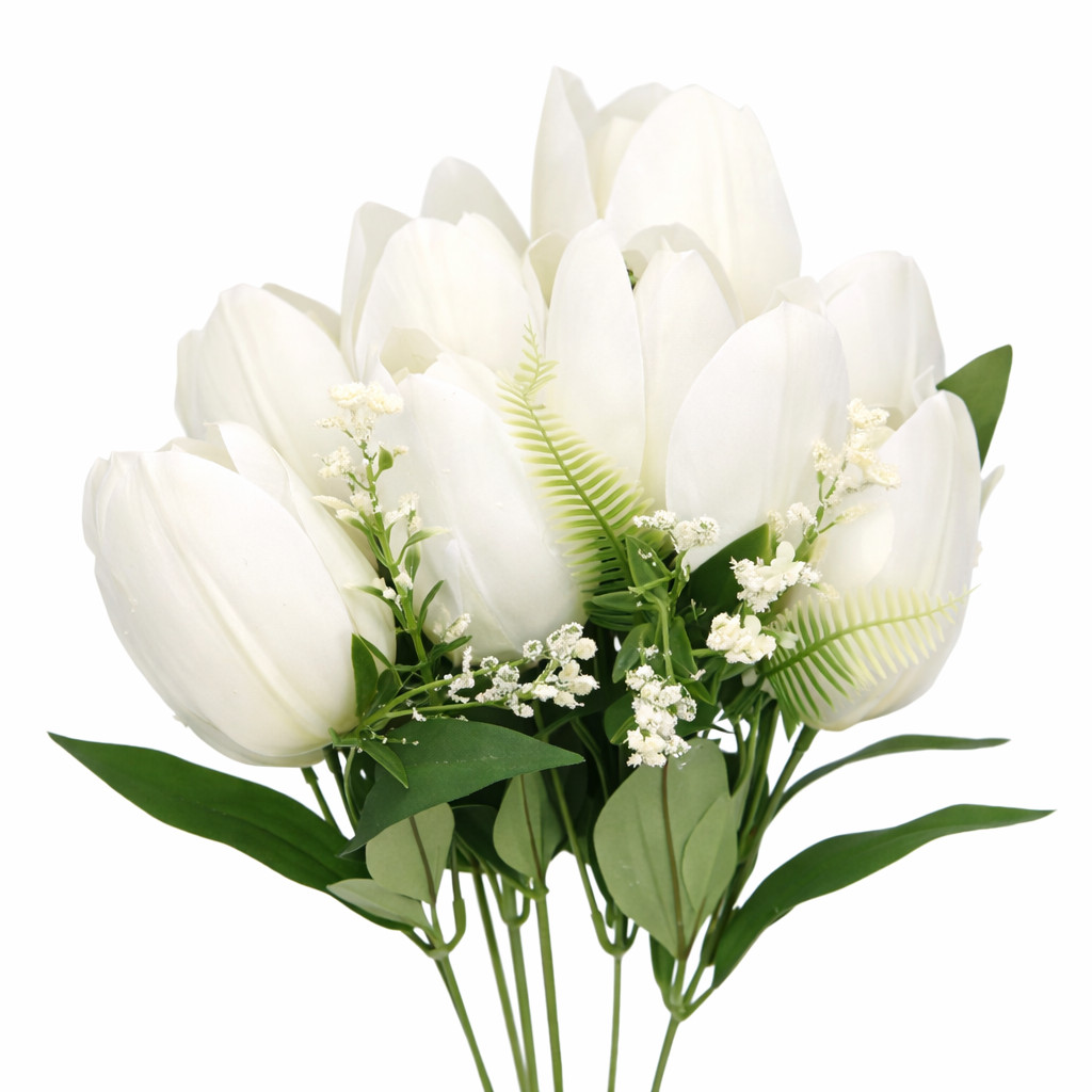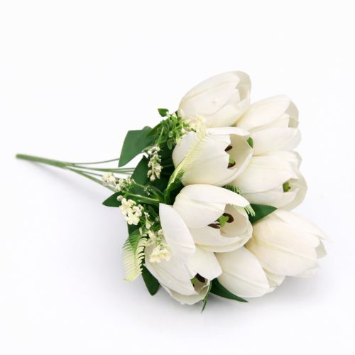 Ideális választás nappaliba, étkezőasztalra, irodába vagy esküvői asztaldíszhez. A fehér selyem tulipán csokor időtálló és gondozásmentes alternatívája a friss virágoknak.