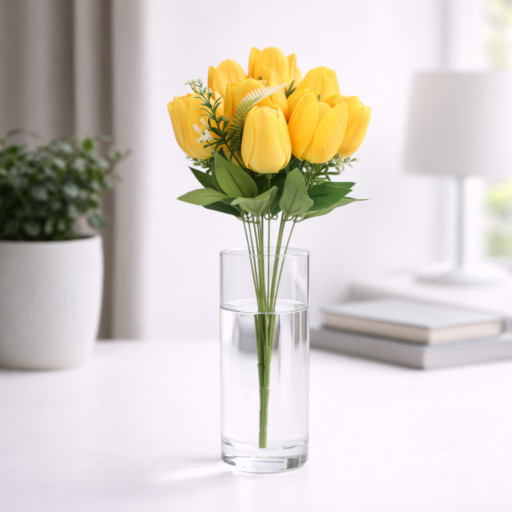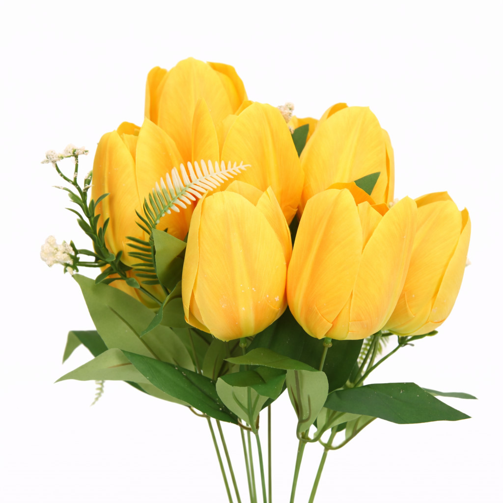 Tökéletes választás nappaliba, étkezőasztalra, irodába, kirakatba vagy rendezvények dekorációjaként. A sárga selyem tulipán csokor tartós és stílusos alternatívája a friss virágoknak.