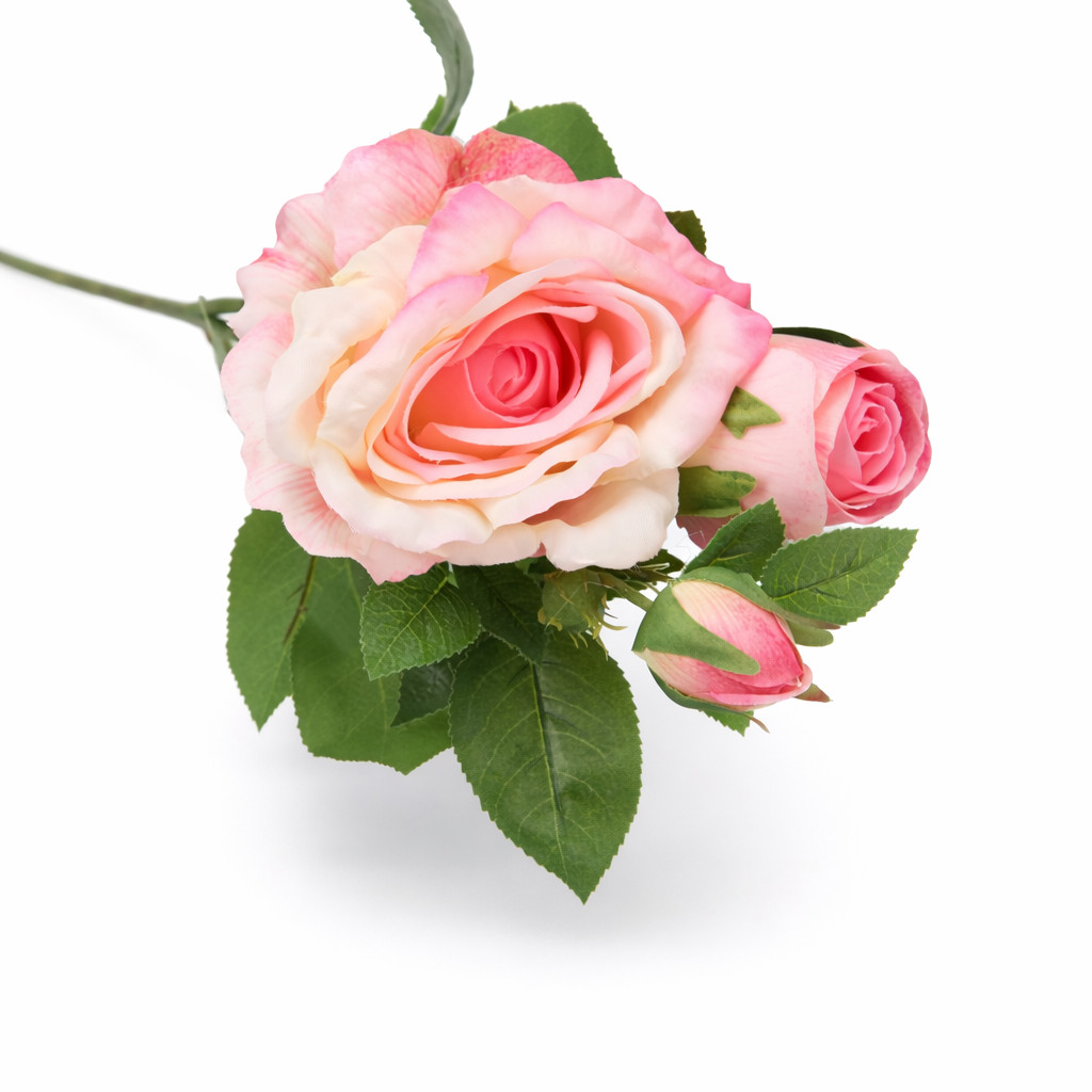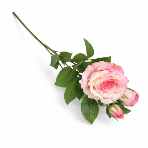 A 66 cm-es 3 bimbós rózsaszín selyem rózsa ág elegáns és élethű dekorációs megoldás. Az egy nyitott rózsafej és két bimbó harmonikus kompozíciója természetes hatást biztosít, így önálló díszként vagy csokor részeként is tökéletes választás.