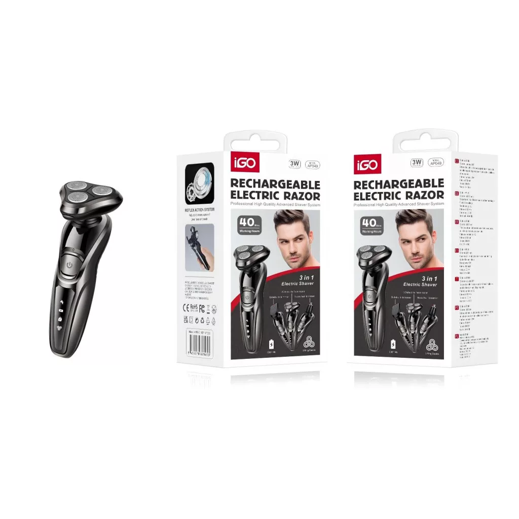 iGO AT930 3 az 1-ben elektromos borotva – újratölthető, 3D forgófejes férfi borotva 40 perces üzemidővel