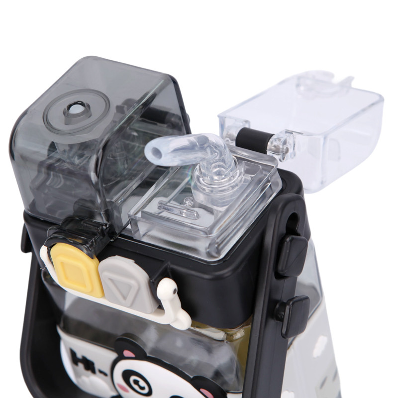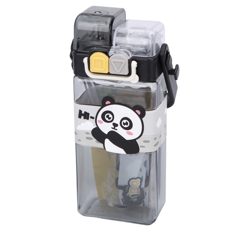 Téglalap alakú gyerek kulacs – fekete pandás, szilikon szívószálas, 0,75 L