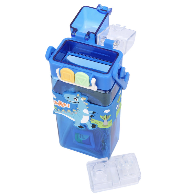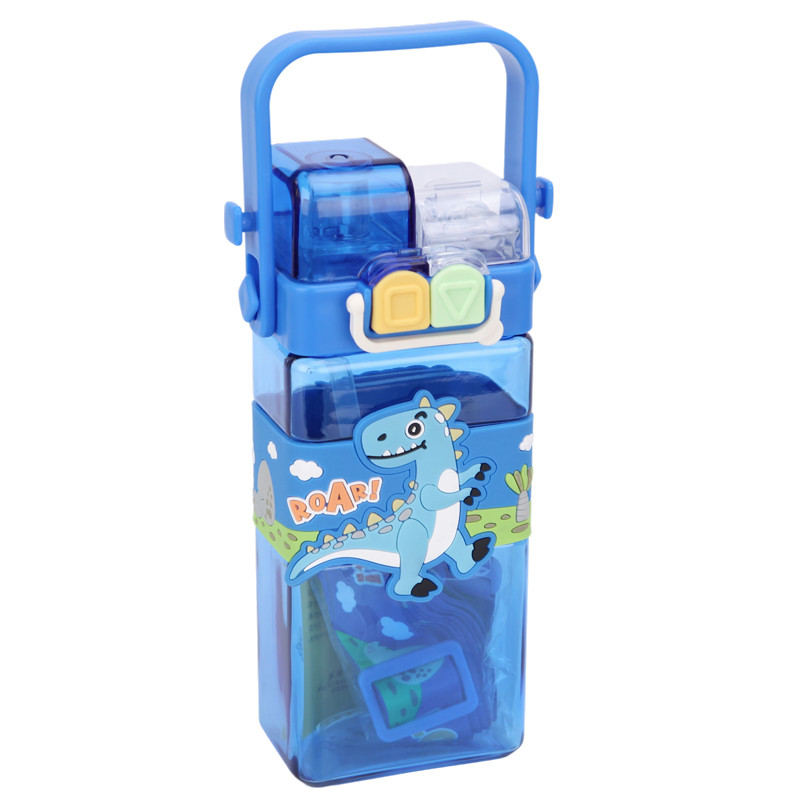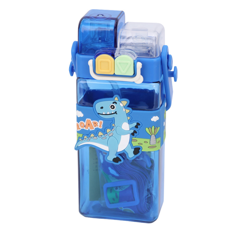 Téglalap alakú gyerek kulacs – kék dinoszauruszos, szilikon szívószálas, 0,75 L
