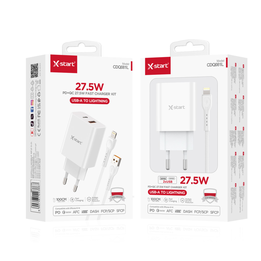 X-start 27.5W Gyors Töltőfej USB-A → Lightning kábellel – PD + QC gyorstöltés, iPhone kompatibilis (CDQ081L)