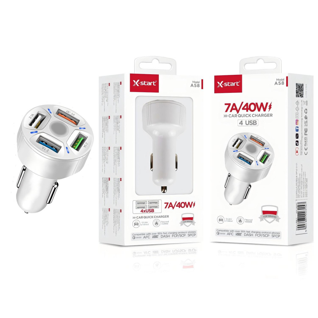 X-Start 7A / 40W szivargyújtós gyors töltő – 4 USB port, univerzális kompatibilitás, intelligens töltés
