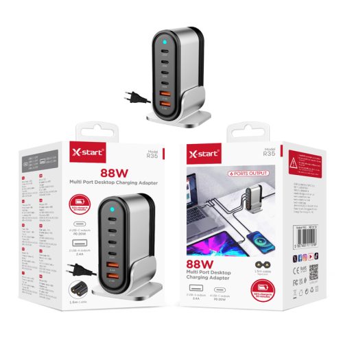 Az X-start 88W asztali többportos gyorstöltő egy praktikus és erőteljes töltőmegoldás, amely lehetővé teszi akár 6 készülék egyidejű töltését. Ideális választás otthonra, irodába vagy akár üzletekbe is, ahol több eszközt kell egyszerre gyorsan és biztonságosan tölteni.