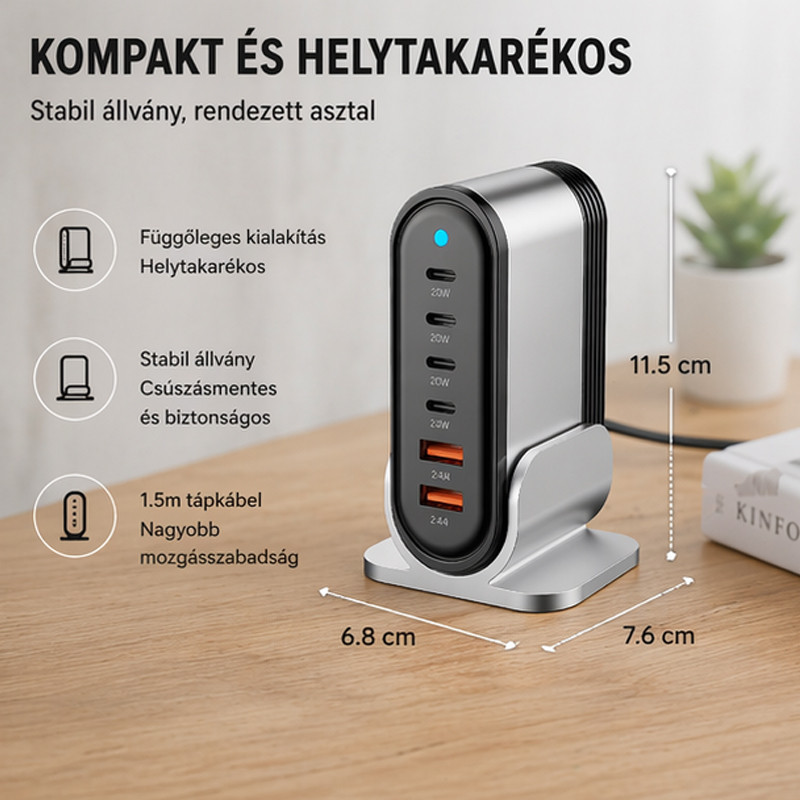 A kompakt, álló kialakítás nemcsak helytakarékos, hanem esztétikus is, miközben a fejlett töltési technológia garantálja a stabil és hatékony energiaellátást minden csatlakoztatott készülék számára.
