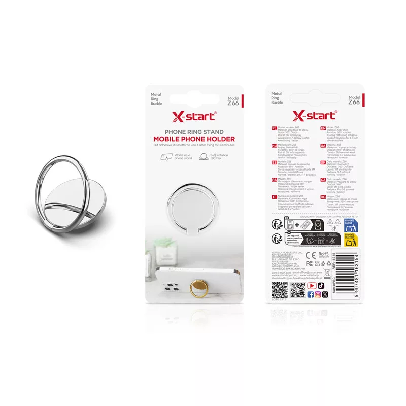 Az X-start Z66 ezüst telefon gyűrűtartó egyszerűen rögzíthető a telefon vagy telefontok hátoldalára. Segít biztosabban kézben tartani a készüléket, miközben praktikus kitámasztóként is funkcionál.