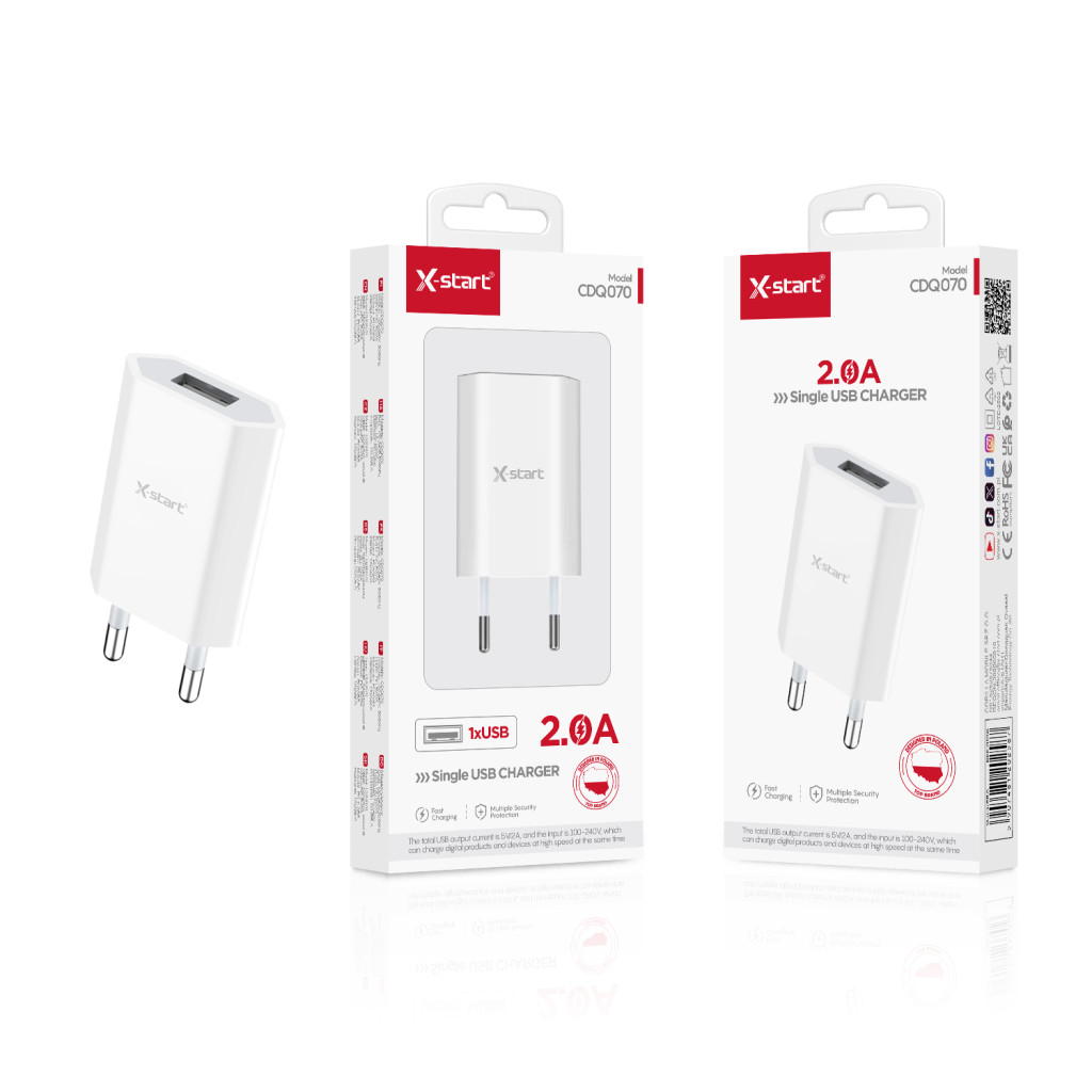 X-start hálózati USB töltő 2.0A – egyportos gyors töltő, fehér (Model CDQ070)